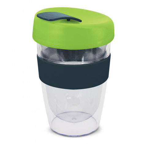 330ml double wall reusable coffee cup which will keep drinks hot for longer. It has a silicone band and a secure screw on lid with a splashproof flip closure. The cup is manufactured from crystal-clear AS plastic and the lid is polypropylene. Both materials are BPA-free. The lid, flip closure and band can be mixed and matched in any colour combination from the standard colours at no extra cost. Up to five different colour combinations are included in the price and more are available for an additional charge. An optional natural gift box is available on request. This product is not dishwasher safe and handwashing is recommended. Express Cup Leviosa is protected under New Zealand Design Registration No. 419451 and Australian Design Registration No. 361937.
