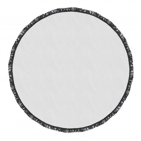 Trendy 150cm round beach towel which is manufactured from fast-drying 240gsm polyester with optional white or black tassels. It can be branded on one side with edge-to-edge full colour print and there is a choice of eight overlocking thread colours. A production lead time of 30 working days applies to this product by air freight and larger orders can be sea freighted on request to reduce the freight cost.