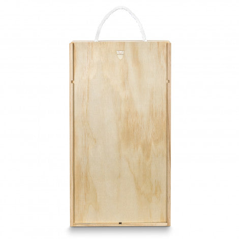 - Elegant wine gift box that will fit two standard wine bottles,Made from natural pine wood with built-in dividers,Sliding lid closure offers a large branding area,Shredded paper filling,Woven cotton rope handle