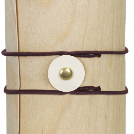 Unique wine presentation tube made from curved natural pine wood. The tube uses a button and tie elastic closure and will hold one standard wine bottle.
