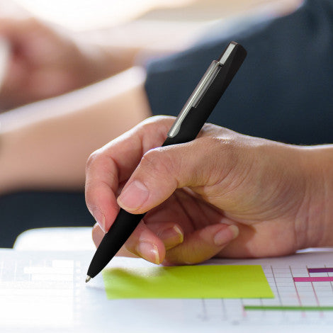 - Premium twist-action ballpoint pen made from recycled stainless steel and ABS,Lower barrel laser engraves to a mirror finish,Soft-touch rubberised barrel,1500m of black Dokumental ink,100% carbon neutral to delivery,Presentation: SPICE branded black paper pen tube